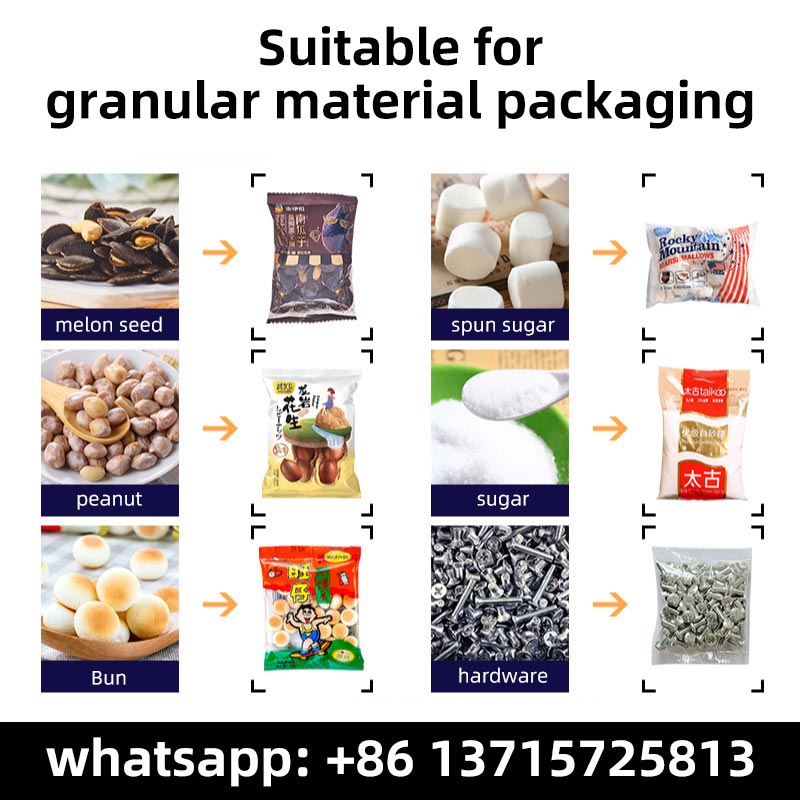 该机械适用于颗粒状和小块状物料的包装,如虾条、花生、麦片、味精、瓜子、白糖、豆类及其他不易粘附的粉状物。